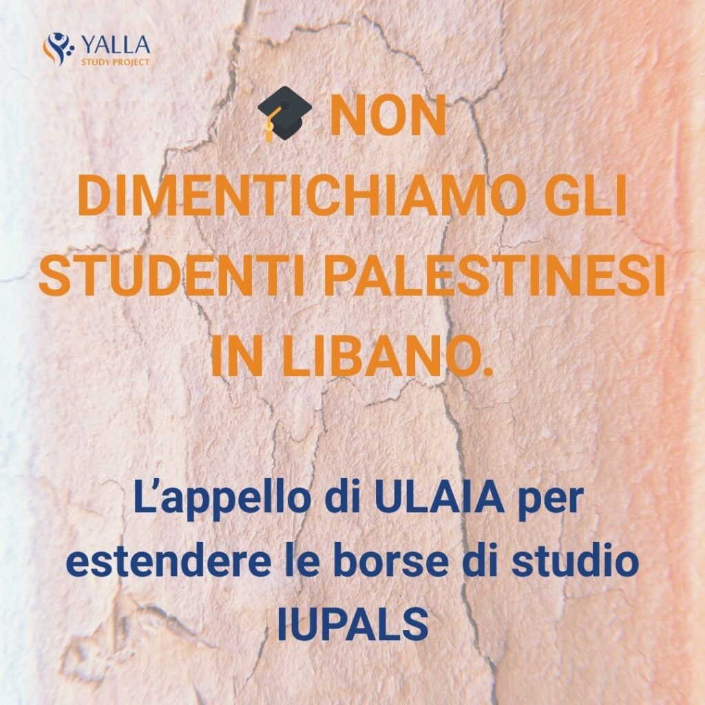 Partita la campagna, in collaborazione con “Yalla Study” per chiedere alla Conferenza dei Rettori Universitari (CRUI) di estendere il programma di borse di studio IUPALS anche agli studenti palestinesi rifugiati in Libano. Consulta qui
